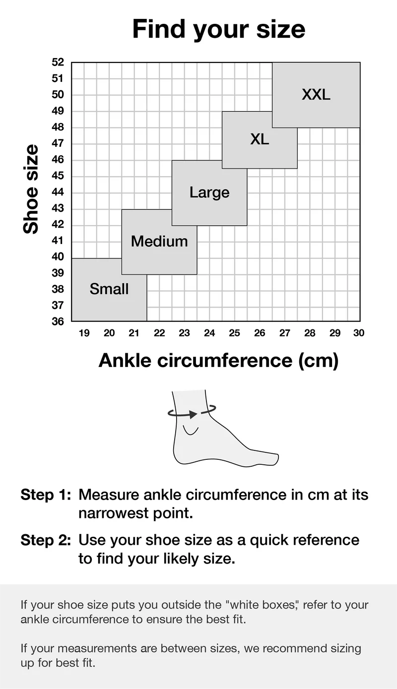 Hvis du føler du ligger mellem 2 størrelser - vælg den største, hvis du har tykkere ankler (smalben) eller vælg den mindste, hvis du har relativt tyndere ankler(smalben).